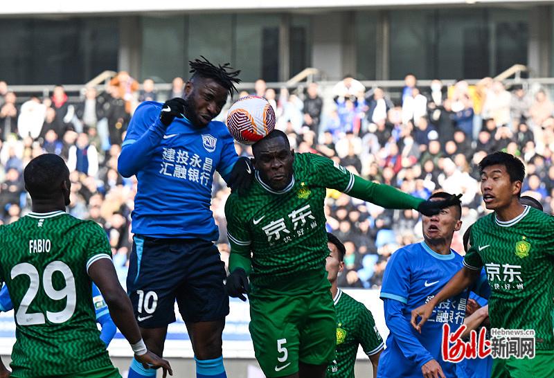 图为沧州雄狮前锋奥斯卡与北京国安球员争抢头球。 河北日报记者耿辉摄