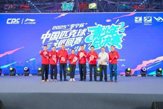 中国匹克球巡回赛组委会秘书长宋鸿飞、厦门市体育局副局长陈岚、厦门市翔安区人民政府副区长张小博、厦门市翔安区文化和旅游局副局长、四级调研员袁一仁、厦门国贸会展集团副总经理、厦门国贸会展运营公司董事长方志国、内蒙古华羽文化发展有限公司董事长林毅、搜房网创始人李忠、唐古拉运动科技(厦门)有限公司董事刘铭共同出席2025“李宁杯”中国匹克球巡回赛青少年总决赛开赛仪式。